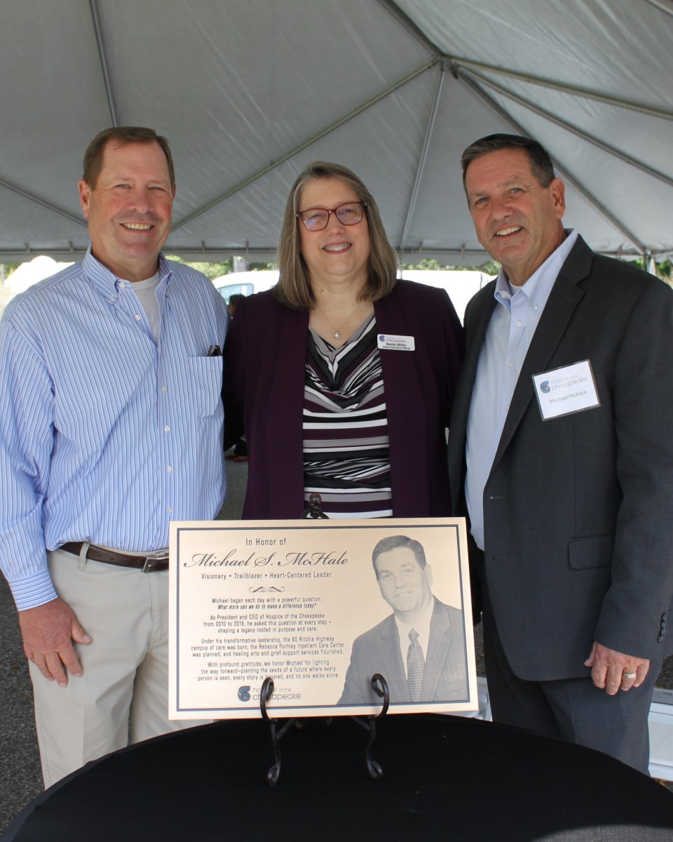 President and CEO Becky Miller reflected on the vision that guided the organization’s move to 90 Ritchie Highway in 2013. The plans included administrative offices, a patient and community call center, a professional education center, a grief support center, a supportive care clinic and an inpatient care center offering hospital-level care in a home-like setting. Gesturing toward each building, Miller shared how each of these goals have been realized.