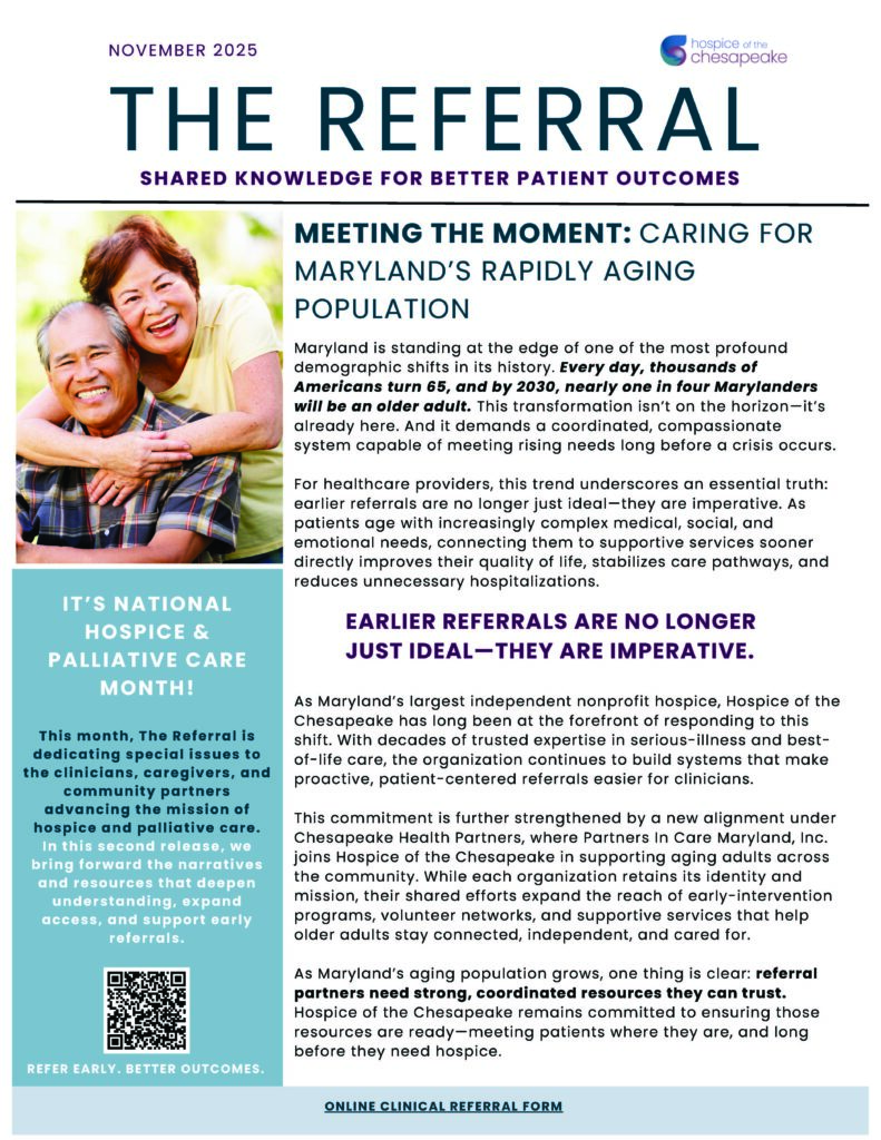 Hospice of the Chesapeake provides physical, psycho-social and spiritual support services to individuals living with and affected by advanced illness. These services are provided wherever the patient calls home. Hospice of the Chesapeake is committed to providing the best possible care for all regardless of their inability to pay.